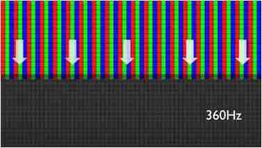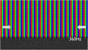 传统液晶驱动是从左到右单向进行,,,,在画面更新速度愈来越愈快的情况下,,,,位于驱动线路末端的右下角区域,,画素的闸极来不及在短时间内获得足够电压,,,无法显示出正确的颜色资讯。。。 |